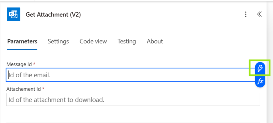 In the Parameters section of the Apply to each action, click the lightning bolt icon (dynamic content selector).