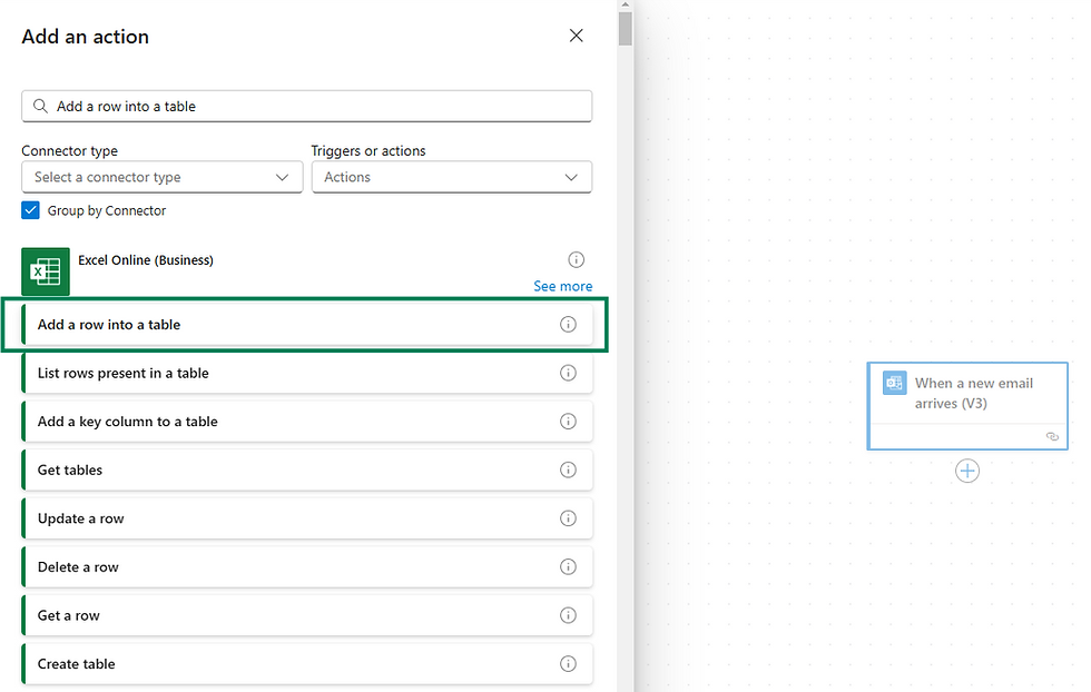 Now, let’s add an action to store the email details in our Excel file.